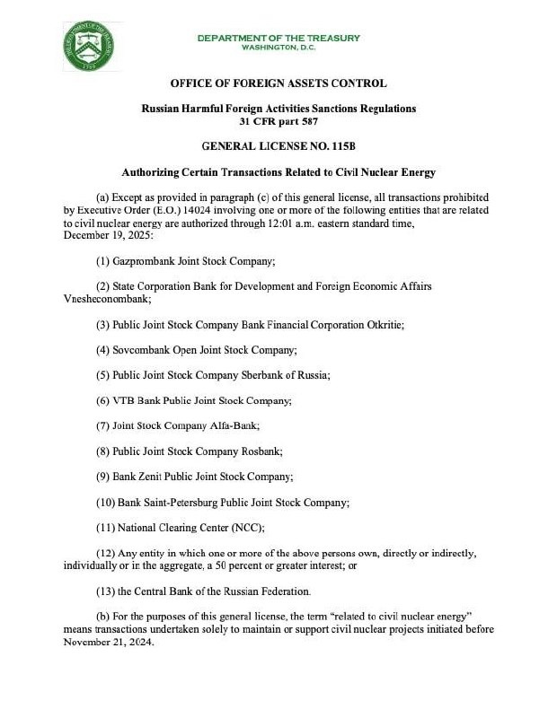 Π±Π°Π½ΠΊΠΎΠ² β Π½ΠΎ Π½Π΅ ΡΠΏΠ΅ΡΠΈΡΠ΅ ΡΠ°Π΄ΠΎΠ²Π°ΡΡΡΡ. Π ΡΠ΅ΠΌ ΡΡΡΡ: 27 ΠΈΡΠ½Ρ Π°ΠΌΠ΅ΡΠΈΠΊΠ°Π½ΡΠΊΠΈΠΉ ΠΠΈΠ½ΡΠΈΠ½ ΠΎΠΏΡΠ±Π»ΠΈΠΊΠΎΠ²Π°Π» General License No. 115B, ΡΠ°Π·ΡΠ΅ΡΠ°ΡΡΡΡ ΠΎΠΏΠ΅ΡΠ°ΡΠΈΠΈ Ρ ΡΡΠ΄ΠΎΠΌ ΡΠΎΡΡΠΈΠΉΡΠΊΠΈΡ
