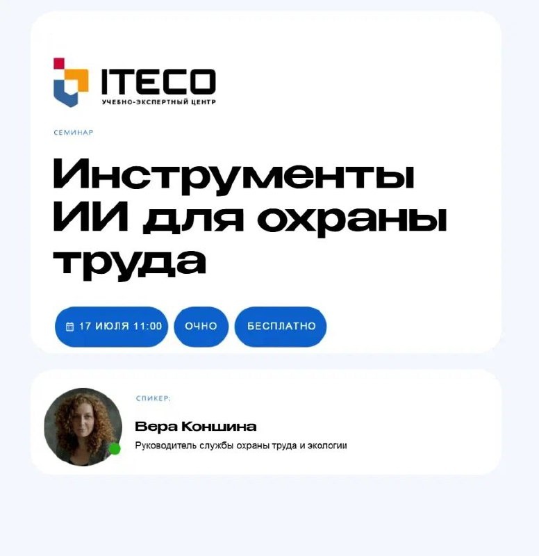 #Семинары ⚡️ Если вы планируете внедрить в работу инструменты ИИ или хотите повысить свою экспертизу в ОТ, приглашаем вас на семинар по теме: «Инструменты ИИ для охраны труда». 🗓 Старт: 17 июля в 11:00 📢 Формат: очно, без онлайн трансляции* 💳 Стоимость: бесплатно 📍 Адрес: Московская область, г. Подольск, ул. Комсомольская, д. 28, стр. 2, 5 этаж, аудитория 506 (БЦ «Пассаж») Спикер: ⭐️ Коншина Вера — руководитель службы охраны труда и экологии Программа 📋 На семинаре расскажем, как применять ИИ-модели на практике, как с их помощью автоматизировать рутинные процессы и решать иные задачи в области охраны, разберем реальные кейсы. Вы получите: - Максимум практики и примеров - Постепенное погружение - от простого к сложному - Домашнее задание с обратной связью 🔗 Записаться *все, кто зарегистрировался, после мероприятия получит запись