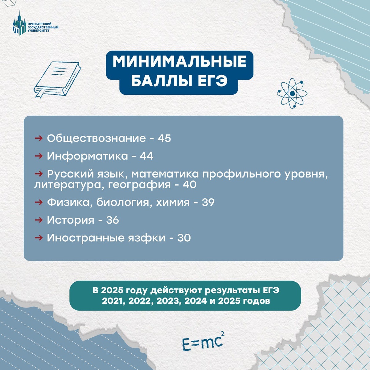 #АбитуриентОГУ2025 Получил результаты ЕГЭ, но не знаешь минимальные баллы для поступления в ОГУ в этом году? Сейчас всё объясним!👀 Минимальное количество баллов по общеобразовательным предметам, необходимое для поступления, представлено на карточке. Весь перечень вступительных испытаний в приоритетной последовательности и с указанием минимального количества баллов для участия в конкурсе можно найти на сайте. ❌ Если балл абитуриента ниже минимума хотя бы по одному предмету, он не сможет подать документы даже на платное место. Выход - подать документы в другой вуз, где баллы ниже, либо поступать в колледж. Мы в тебя верим, дорогой абитуриент! До встречи в ОГУ 🤗 #в_ОГУ #ОГУ #OSU #АбитуриентОГУ2025