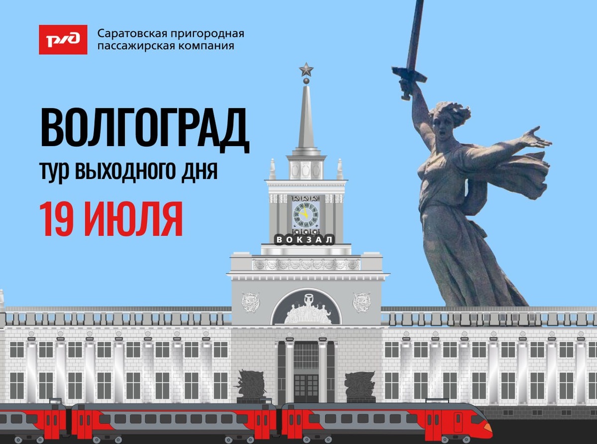 🤩 Волгоград зовет в гости 19 июля! Отправляйтесь в незабываемое путешествие на электропоезде и прикоснитесь к истории города-героя. Всего пять часов в пути – и вы окажетесь в самом сердце Волгограда, где вас ждет насыщенная программа: - Величественный Мамаев Курган, место ожесточенных сражений, где пройдет пешеходная экскурсия - Обзорная экскурсия по городу с посещением знаковых мест: Аллея Героев, Дом Павлова, Мельница Гергардта и многое другое - Уникальная экспозиция под открытым небом на территории музея-панорамы "Сталинградская битва" (билеты не входят в стоимость экскурсии) 🚈 Поездка на электропоезде – это комфорт и удобство, а наша экскурсионная программа позволит вам максимально эффективно использовать время и узнать много нового. 🕓 Расписание: - время отправления 06:38 ЖД Вокзал, г. Саратов (время местное) - время прибытия о.п. Мамаев Курган, г. Волгоград 10:50 (время московское) - время прибытия ЖД Вокзал, г. Волгоград 11:01 (время московское) - время отправления из Вол