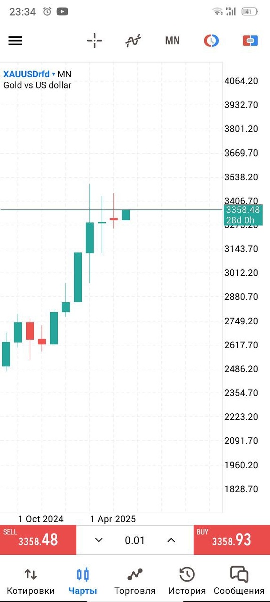Золото в долларах.Таймфрейм 1 месяц.Сформированна классическая фигура продолжения тренда.Прогноз до конца года 4000