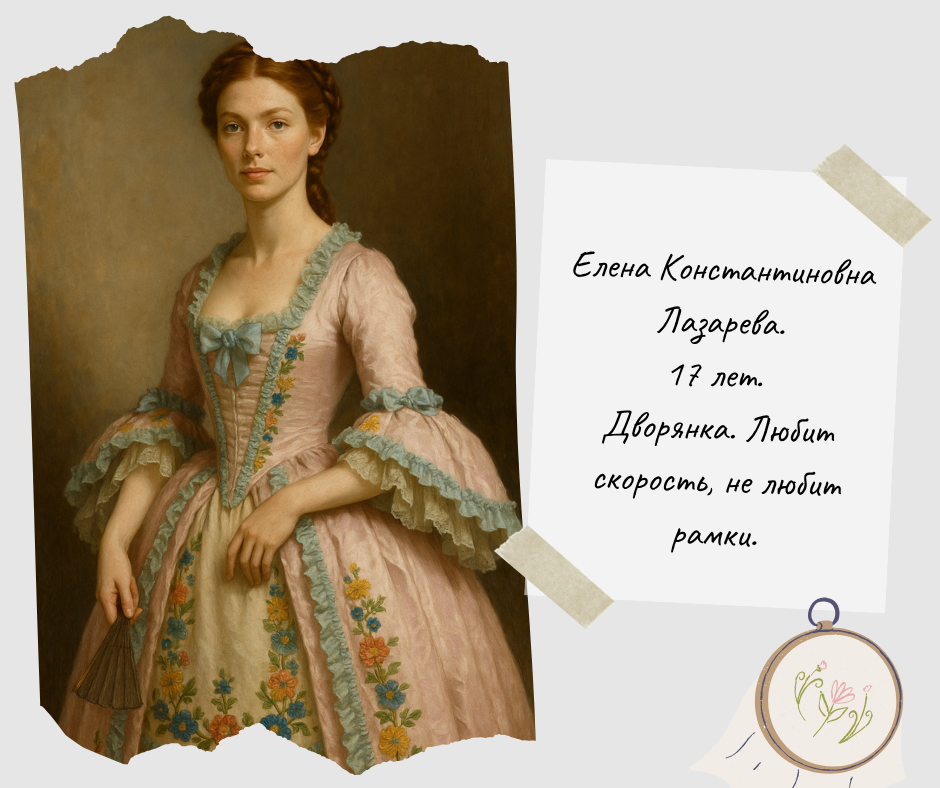 Ей 17. Она — дворянка, но скорее из тех, кто закатывает глаза на слова о «приличиях». Она не ищет драмы.