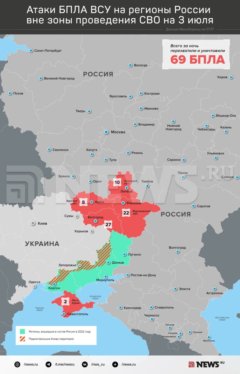 ВСУ ночью совершили массированную атаку БПЛА на российские регионы: было сбито 69 украинских дронов. Больше всего беспилотников уничтожили над Белгородской областью — 27, сообщили в МО РФ. Еще 22 БПЛА — над территорией Воронежской области, десять — над Липецкой. В последнем регионе обломки одного из дронов рухнули на частный жилой дом, из-за чего погибла 70-летняя пенсионерка, два человека ранены. В Ельце поврежден фасад строящейся секции многоквартирного дома, а на парковке одного из городских предприятий произошел пожар, сообщил губернатор Артамонов. ⭕ Подписаться | Прислать новость | Буст