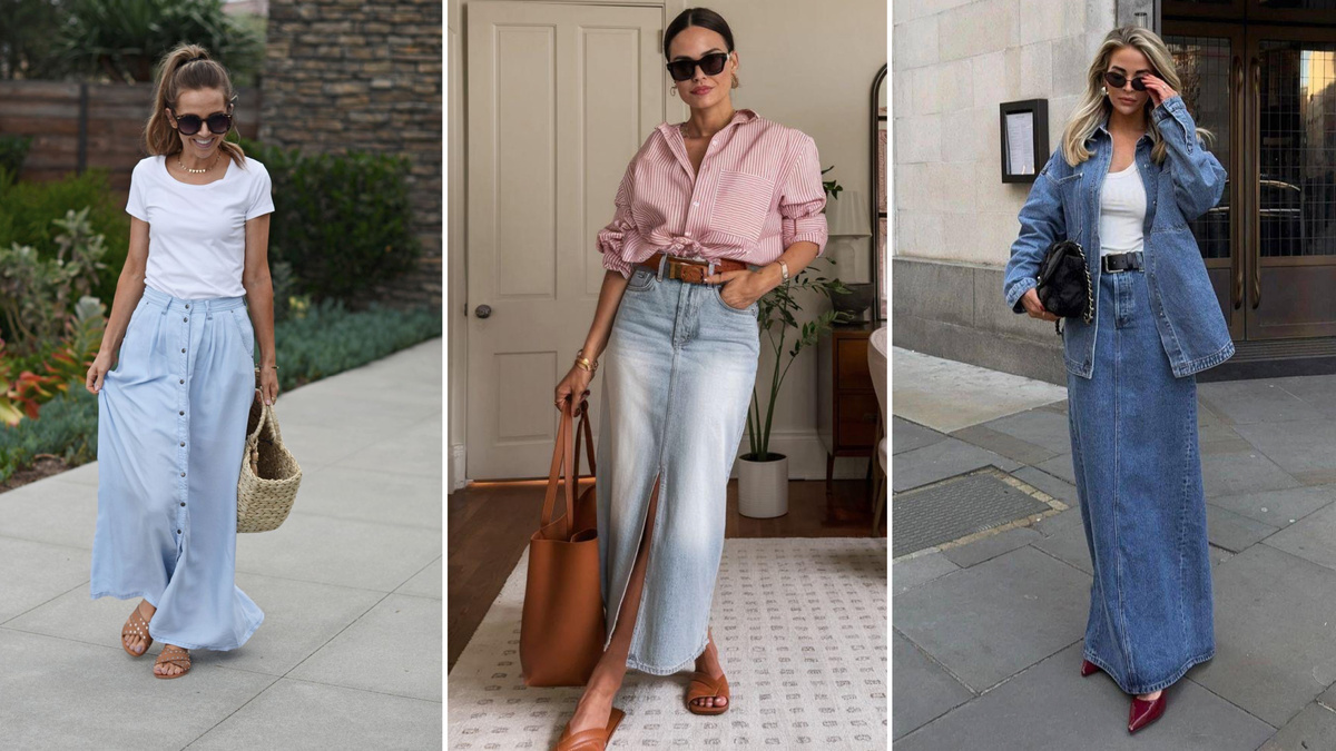 Джинсовая юбка прочно заняла место в нашем гардеробе, видоизменяясь, в зависимости от трендов. Например, в сезоне 2025 актуальными будут юбки макси. Плюсов у такого фасона очень много: она делает акцент на талии, скрадывает излишний объем в бедрах, удлиняет ноги и отлично комбинируется с разной обувью, а плотный деним делают нашу фигуру более собранной. Кроме того, она отлично вписывается в отличные аутфиты. Смотрим и берем на заметку. Давайте для начала выберем модную юбку, ведь длина – это важный, но не единственный фактор. Так, очень актуальны юбки с разрезами сзади или спереди. Еще один момент – это выбор цвета. Самые трендовые это нежно-голубой деним и индиго. Еще одна важная фишка – это юбки с не подшитым краем, пуговицами и потертостями. Это юбка, белая футболка и кроссовки. Футболку советуем брать плотную, без рисунков или минималистичными принтами. Если носить футболку заправленной, то это сразу даст вам плюс к стройности и длине ног. Сама же джинсов макси юбка может быть люб