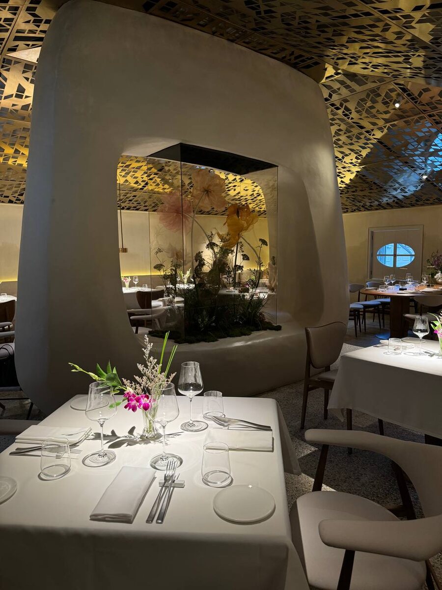 Продолжаю обозревать fine-dining рестораны Москвы, на очереди Artest. Напомню, что в 2021 году ресторан получил 2 звезды Michelin. Так сложилось, что звезды у нас не продлевают, но ресторан держит марку и все на высочайшем уровне. В ресторане два зала и большая веранда. Первый зал камерный, здесь находится кухня ресторана и chef’s table. Второй этаж светлый и просторный, в центре большой роскошный камин, который летом превращается в цветочную инсталляцию, а над головой акцентный золотой металлический потолок. Мы попробовали несколько блюд, и все они были идеальны, сбалансированы и гармоничны. 🛑Форель 2400₽ — пюре горошка, сырный бешамель, красная икра, очень нежно, находится в разделе закусок, но можно брать как полноценное блюдо 🛑Угольная рыба 2700₽ — мини романо с сальсой, сливочный соус с добавлением перца андалиман, угольная рыба отдельная любовь, блюдо очень вкусное и сытное 🛑Кролик 2700₽ — блюдо дополняют птитим, зелёный горошек и соус на основе гарума. Блюдо существует здесь