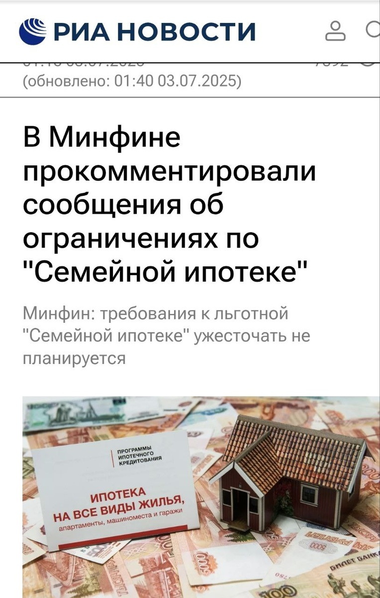 В ответ на пост Минфин официально поддержал моё мнение 👇 МОСКВА, 3 июл - РИА Новости. Требования к льготной ипотечной программе "Семейная ипотека" ужесточать не планируется, ее выдача ни в одном из банков не приостанавливается, сообщили РИА Новости в Минфине РФ. Ранее ряд телеграм-каналов писали о возможных ограничениях в программе семейной ипотеки с июля и о том, что банки активно готовятся к к сокращению выдачи таких кредитов. "Ужесточать требования к льготной ипотечной программе не планируется… Сейчас банки выдают кредиты в рамках общего объема средств по программе. Выдача ни в одном из банков не приостанавливается", - ответили в пресс-службе Минфина на вопрос агентства о возможности сокращения выдачи кредитов по этой программе. Я же говорю, читайте правильных брокеров/блогеров, а не хайпожоперов! Всем хорошего дня. #ипотекапомощь #кредитныйброкер #Светлов #льготнаяипотека #семейнаяипотека