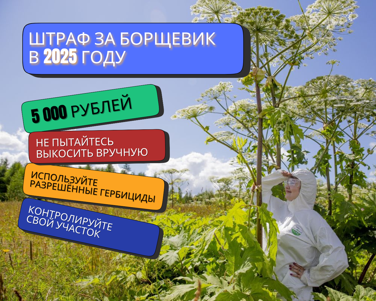 Штраф за борщевик в 2025 году увеличился 🚨 Теперь владельцам земельных участков придется платить больше за неудаление опасного растения! Что же именно поменялось и почему это так важно? ⬇️ 📌 Ранее размер штрафа варьировался от 2 до 5 тысяч рублей, однако с 2025 года сумма фиксирована — 5 000 рублей. Борщевик — это не обычный сорняк, а настоящее биологическое оружие против окружающей среды и здоровья людей! ⭐️ Почему борщевик опасен? • Ожоги кожи (следы от них не проходят до года) и аллергия — риск велик, особенно для детей. • Уничтожает экосистемы, вытесняет полезные культуры и нарушает природный баланс. 💥 Историческая справка: в советское время растение активно культивировали как кормовую культуру, но вскоре оно стало настоящим врагом №1 среди растений-вредителей. ❗️ Что предпринять владельцу участка? ✅ Используйте специальные средства защиты и разрешенные гербициды, лучше всего обращайтесь в специальные службы. ✅ Регулярно проверяйте территорию, поскольку даже единичный росток спо