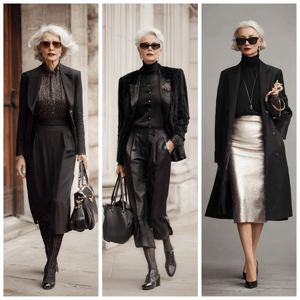 Чёрный — классика, спору нет. Но с головы до пят после 50 — это риск. Может сделать образ слишком строгим, приглушить естественное сияние кожи.