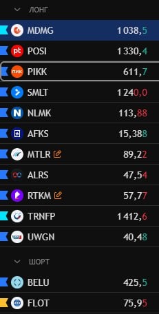 АКЦИИ В МОЕМ СПИСКЕ НА СЕГОДНЯ НА СКРИНАХ 🤓 Подробный видео обзор Сначала смотрим на общий фон и только потом принимаем какие-либо решения ☝️ Особо выделяю к просмотру: 🟢Для Лонга $PIKK Тенденция восходящая. В коррекции нет агрессивных продаж + минимумы повышаются. С большей вероятностью будем вылетать выше. $AFKS Рассмотрим таймфрейм 1 час. Минимумы и максимумы повышаются. Тренд восходящий. Нет агрессивных продаж в коррекции. Всё что выше 15 - это поиск покупок. $MDMG Было долгое накопление пробили сопротивление 1036 7 дней подряд показывает рост. Можем и дальше продолжить ускорение, поэтому пристально наблюдаем на младшем таймфрейме. $MTLR Сильный импульс в левой части графика. Пока цена внутри него и выше 86,47 - это поиск покупок. Главное, чтобы в коррекции не было агрессивных продаж. 🔴Для Шорта $BELU Спроса нет. Находимся внутри агрессивных продаж. Пока находимся ниже 438,5 - ищем шорты. У остальных акций много нюансов. Уже во время сессии будем рассматривать остальные.