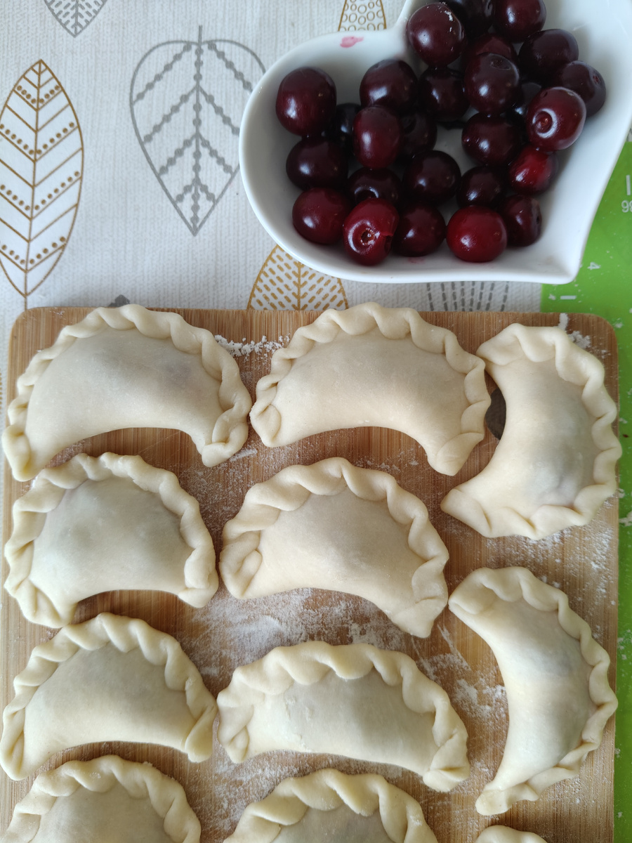 Решила приготовить вареники с вишней. Нашла очень классный рецепт, которым хочу поделиться. Вдруг кому-то пригодится. К сожалению, фотографий процесса не сделала. Предоставлю как есть. Для приготовления понадобится 180 мл воды (можно воду соединить с молоком) закипятить, добавить щепотку соли. Пока вода кипит муку (280 г) просеиваем в миску и делаем углубление в середине. В эту середину наливаем 2 ст. ложки растительного масла без запаха. И заливаем кипячёную воду. Все перемешиваем лопаткой. Тесто будет выглядеть, как крошка. Мешаем, пока тесто не станет температуры, комфортной для ваших рук. Как только тесто подостынет, можно брать его руками и месить. Должно получиться гладенькое эластичное тесто. Оставляем тесто отдыхать минут на 15. Пока можно подготовить вишню. Промыть, вытащить косточки (а можно и с косточками). В отдельной мисочке смешиваем сахар по вкусу и крахмал. Крахмал нужен, чтобы начинка не растекалась (также можно обойтись и без крахмала). Как только все подготовили,