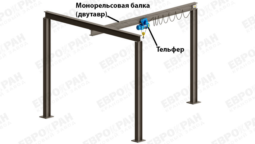 - Монорельс — это стационарная балка. Тельфер по ней передвигается в одном направлении, но сама балка не двигается.