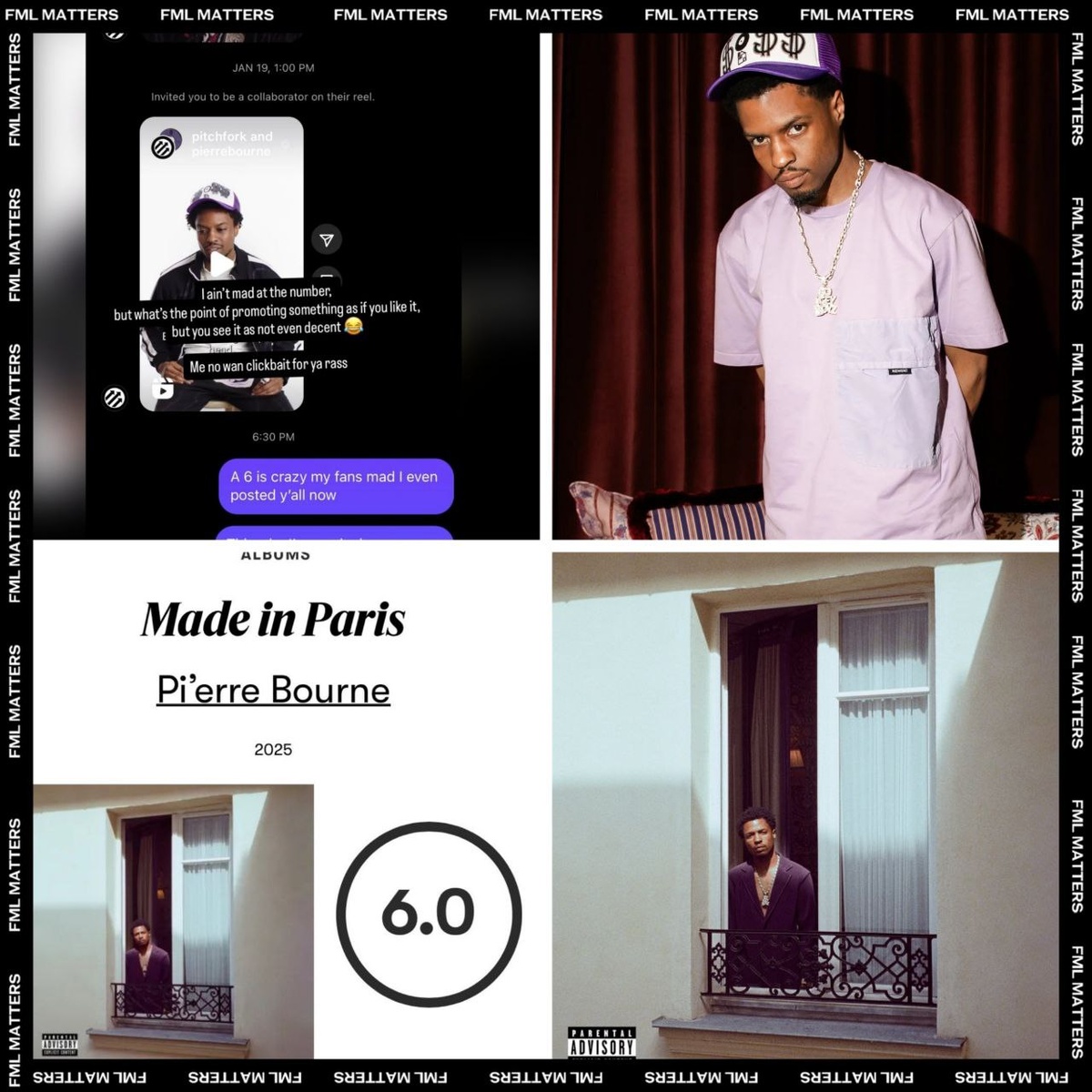 ❌ PI'ERRE BOURNE НАЕХАЛ НА PITCHFORK! Bourne публично выразил недовольство в социальных сетях после того, как музыкальное издание сначала пригласило его поучаствовать в своих съемках и активно рекламировало его альбом «Made in Paris», а потом поставило ему низкую оценку — 6 из 10. Он говорит, что не понимает, зачем делать вид, что поддерживаешь артиста, если на самом деле так не считаешь. «Я не злюсь на эту оценку, но какой смысл рекламировать что-то, будто вам это нравится, если вы сами считаете это даже неприличным?» «Шестёрка — это безумие, мои фанаты в бешенстве. Вот почему я делаю свой собственный контент, потому что у вас у всех хватает наглости» Для общего сравнения с другими оценками недавних альбомов: ➖ OSAMASON — Jump Out (8.2 баллов); ➖ The Weeknd — Hurry Up Tomorrow (7.8 баллов); ➖ Playboi Carti — MUSIC (7.7 баллов); ➖ Ice Spice — Y2K (7.6 баллов); ➖ Tyler, The Creator — CHROMAKOPIA (7.6 баллов); ➖ Ken Carson — More Chaos (7 баллов) ➖ Kendrick Lamar — GNX (6.6 баллов)