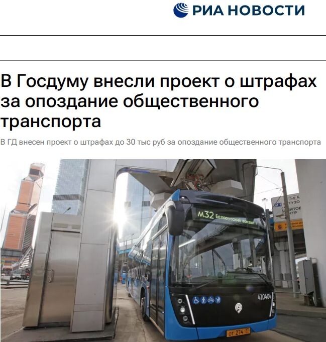 Перевозчиков начнут штрафовать за опоздание общественного транспорта - такой законопроект внесен в Госдуму. Сумма штрафа до 30 тыс. рублей. Максимальный срок допустимого опоздания или задержки отправления рейса - 15 минут для городского транспорта, 1 час для междугороднего и 4 часа для международных рейсов. В настоящее время административная ответственность за опоздание общественного транспорта и задержку отправления не предусмотрена.