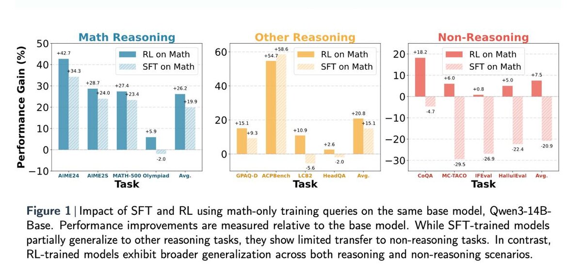 🧠 Теперь можно вычислять LLM, которые «накрутили» баллы на бенчмарказ по математике, но не умеют больше ничего. В свежем исследовании *“Does Math Reasoning Improve General LLM Capabilities?”* показано, что модели, обученные на математике с помощью SFT, часто не улучшаются вне математики — а иногда даже деградируют. 📊 Что выяснили: • SFT на математике → ухудшение на нематематических задачах • RL на математике → перенос улучшений в другие домены • SFT вызывает сильное смещение представлений и токен-дистрибуций • RL наоборот — сохраняет топологию модели и двигает только логические оси 🧪 Авторами разработан новый инструмент — Transferability Index: Это простое соотношение между улучшением на математике и изменением на сбалансированном наборе задач. Помогает понять: ✔️ где модель реально умнее ❌ а где — просто бенчмарк‑максинг 📌 Вывод: RL-постобучение лучше предотвращает «забвение» и делает LLM более универсальными. SFT — может казаться эффективным, но часто ухудшает общие способнос