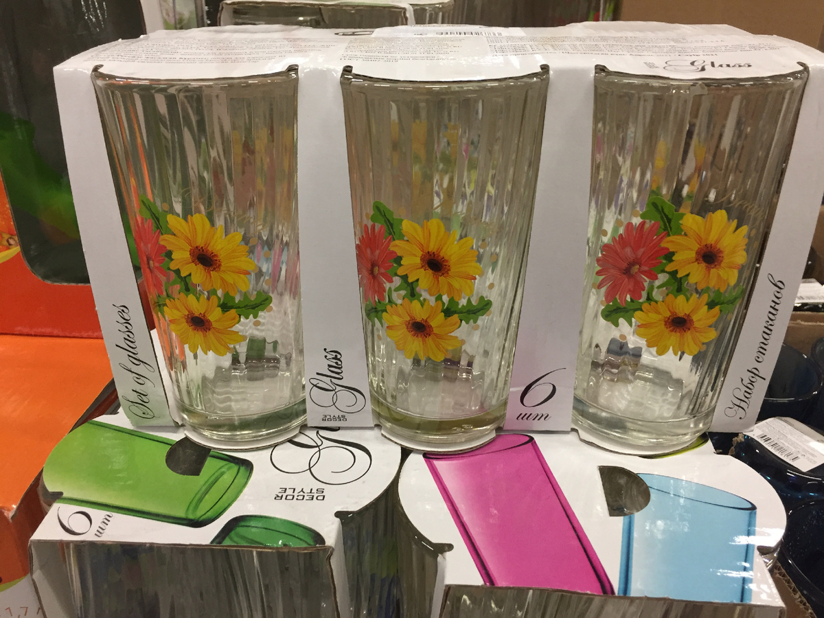 В продаже появились наборы высоких стаканов с декором в ассортименте. Этот набор состоит из 6 стаканов объемом 230 мл. В составе стекло. Подходят для подачи воды, сока, коктейлей и других напитков. Каждый стакан украшен стильным рисунком. Подходят для подачи как холодных, так и умеренно теплых напитков. Упакован набор в красивую картонную коробку, может послужить подарком. Изготовитель Россия, г. Гусь-Хрустальный.