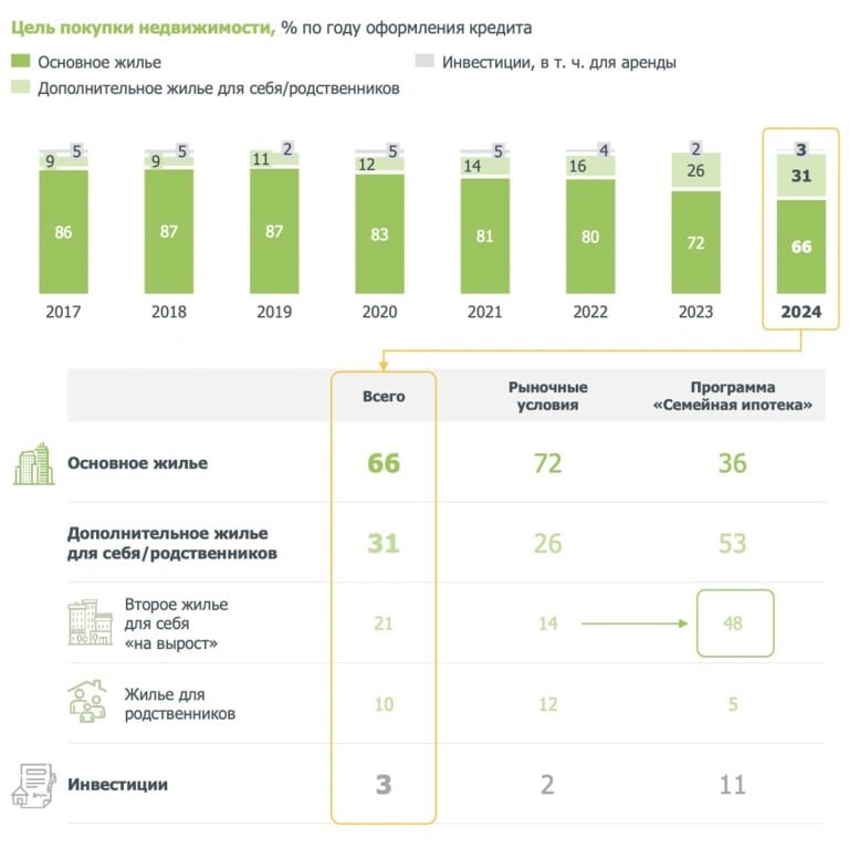 Льготные программы стимулировали покупку второго жилья «на вырост». Например, по семейной ипотеке в прошлом году второе жилье для себя «на вырост» купили почти половина заемщиков (48%) • Как распределились сделки: ⇒ 48% — второе жилье ⇒ 5% — для родственников ⇒ 36% — первое и основное жилье ⇒ 11% — инвестиции (сдача или перепродажа) • По рыночной ипотеке в 2024 году доля сделок, где приобреталось основное жилье, была выше — 72%.