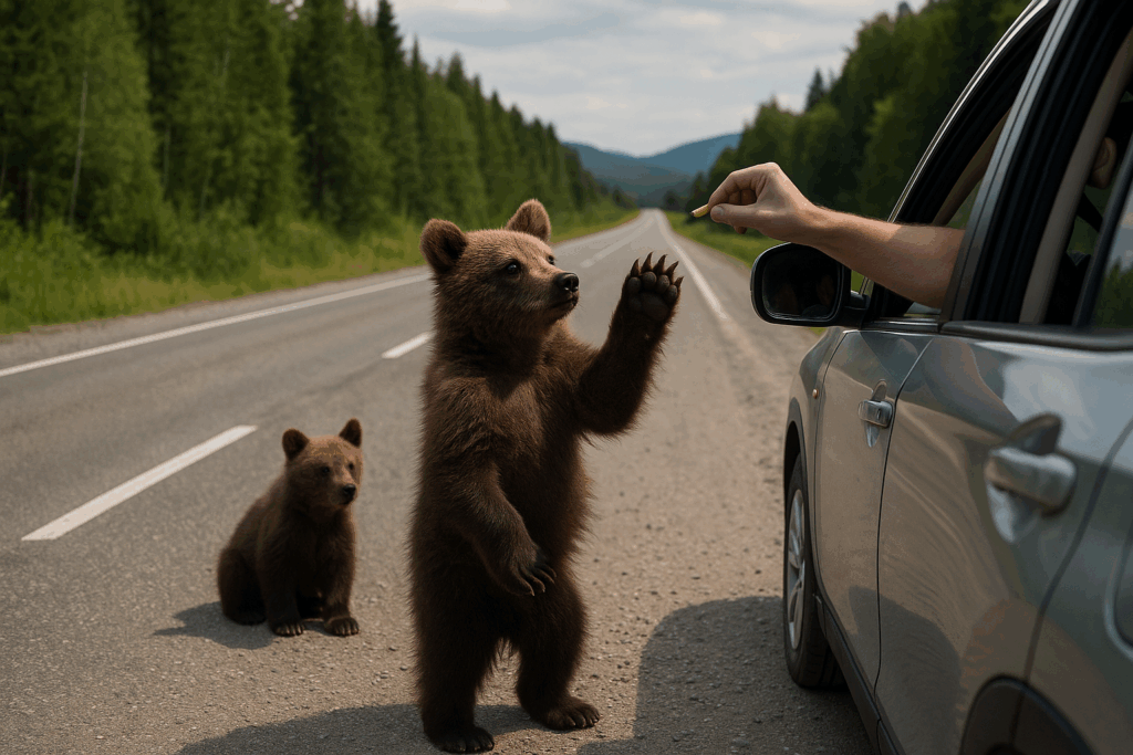 Потерявшие маму медвежата выпрашивают еду на трассе Камчатки