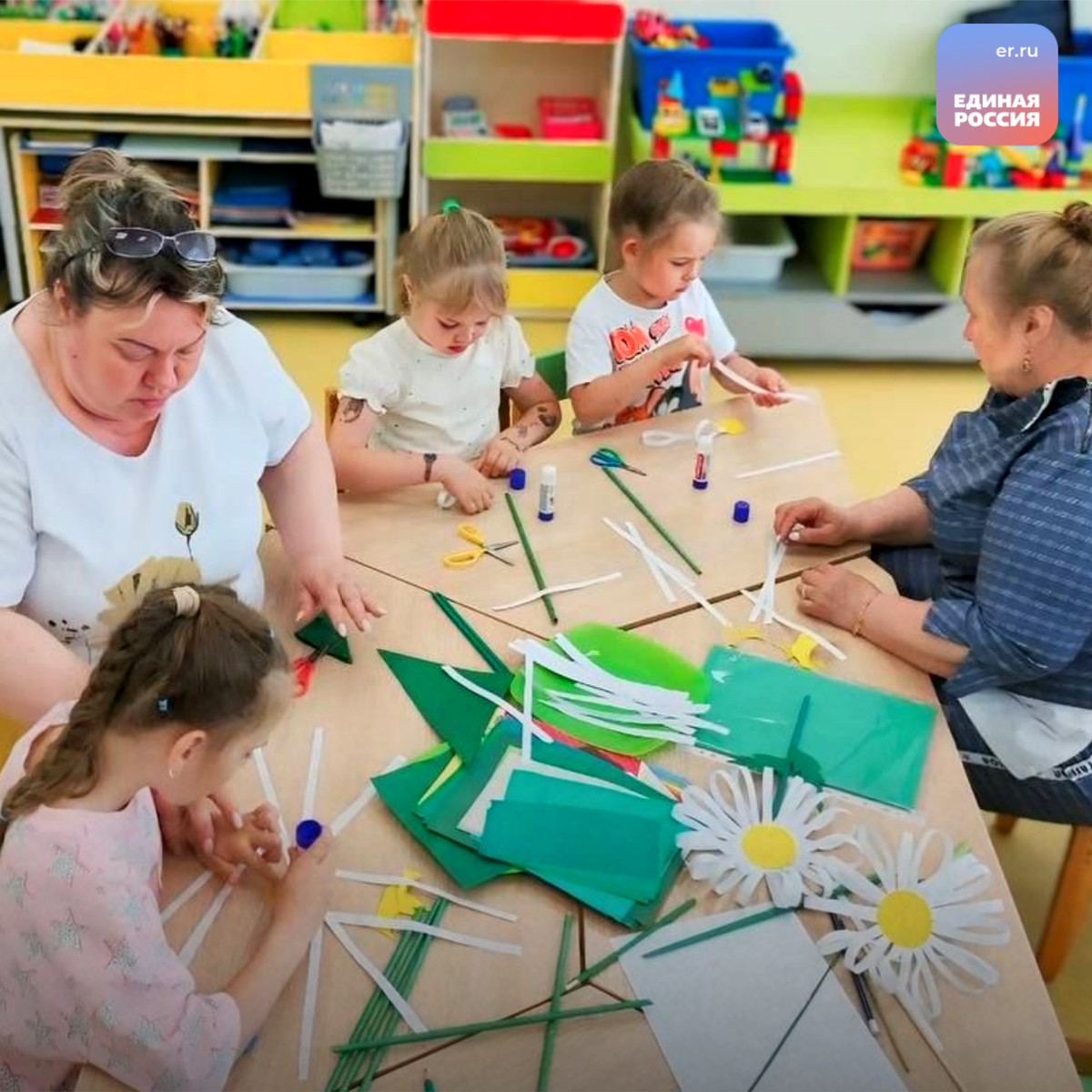 Мастер-класс по изготовлению ромашек провели партийцы для воспитанников детского сада Губкинского