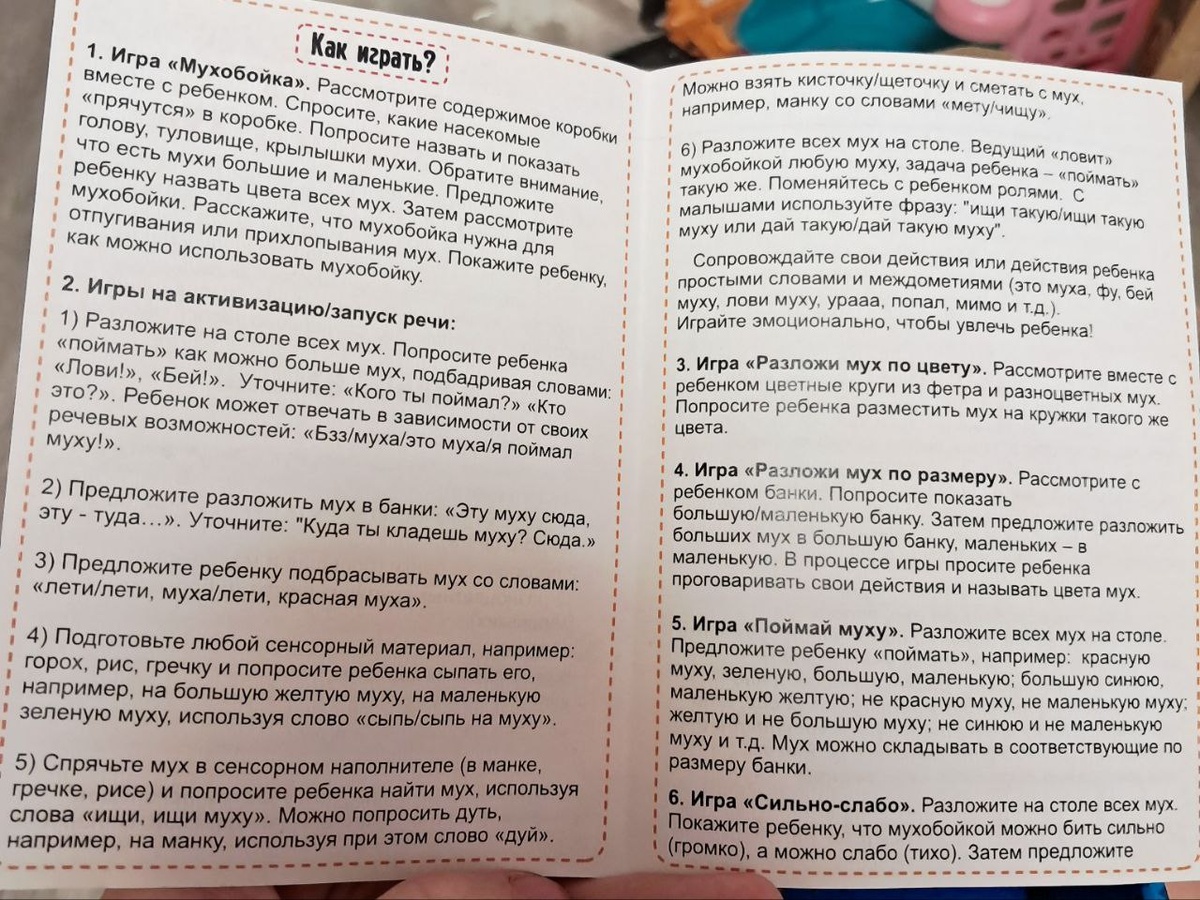 🔤🔤🔤🔤 🔤🔤🔤🔤❕ Игра фаворит наших детей. Да и я восхищаюсь играми,где дети могут играть вместе независимо от возраста. У игры такое большое наполнение,что можно играть не только по правилам,но и придумывать игры самим. В наборе: ⏺2 мухобойки ⏺12 маленьких мух ⏺12 больших мух ⏺1 маленькая тара ⏺1 большая тара ⏺6 маленьких разноцветных кругов из фетра ⏺6 больших разноцветных кругов из фетра ⏺деревянный планшет для сортировки мух ⏺6 двухсторонних карточек с заданиями ⏺кубик ⏺правила Варианты игры: ⏺Ознакомление-поговорим и рассмотрим мух и мухобойки. ⏺Разложи мух по цвету/размеру-используем цветные кружки, тару и планшет. ⏺Поймай муху-используем мухобойки.Ловим на скорость, используем кубик,просим поймать определённый цвет и размер.Складываем в тару улов. ⏺Запуск речи-проговариваем все действия. ⏺Запуск мух-чья муха дальше полетит. 🤩 Очень важно,что игра долго не надоедает детям,так как в ней используются не только интеллектуальные способности, но и обычные детские забавы. В