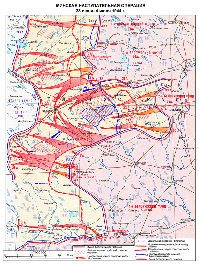 …Вторая мировая война смертельным катком прошлась по всей территории Беларуси. Тем важнее сегодня вспомнить основные вехи героической борьбы советского народа с немецко-фашистскими захватчиками. И одно из центральных событий той страшной войны – освобождение столицы БССР города Минска. Подготовка Белорусской наступательной операции началась весной 1944 года. Исходя из военно-политической обстановки и предложений военных советов фронтов, Генштаб разработал ее план. После его всестороннего обсуждения в Ставке Верховного главнокомандования 22-23 мая было принято окончательное решение о проведении стратегической наступательной операции. Белорусская наступательная операция под кодовым названием «Багратион» была строго засекречена и началась 23 июня, а завершилась 29 августа 1944 года. Замысел ее состоял в том, чтобы одновременными глубокими ударами на шести участках фронта прорвать оборону противника, расчленить его войска и разбить по частям. В дальнейшем предполагалось нанести удары по сх