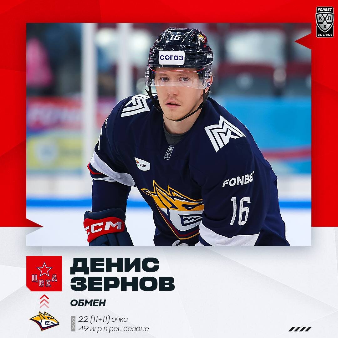 🐴 Денис Зернов пополнил состав московского ЦСКА в результате обмена с «Металлургом» — в обратном направлении проследовал форвард Руслан