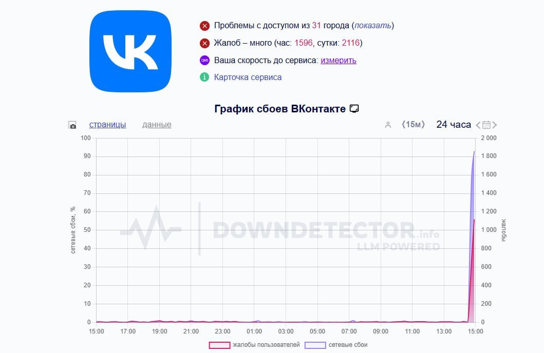 Пользователи сообщают о сбое в работе "ВКонтакте", на сервисе Downdetector уже более 1,5 тысячи жалоб В компании заявили РИА Новости, что они работают над восстановлением доступа к сайту. @SPUTNIKBY