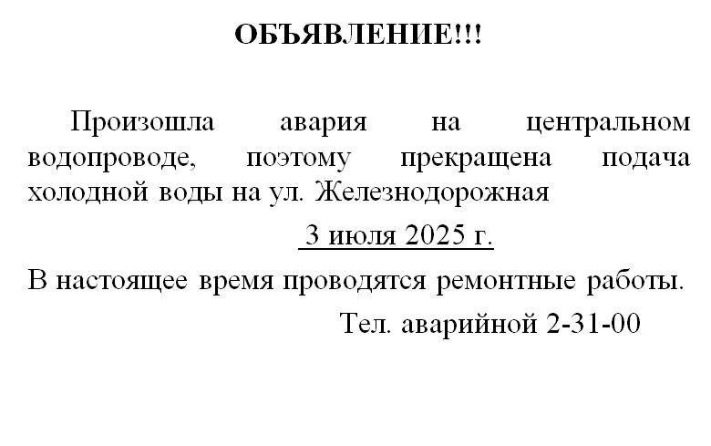 Произошла авария на водопроводе, поэтому прекращена центральном подача холодной воды на ул. Железнодорожная 3 июля 2025 г. В настоящее время проводятся ремонтные работы.