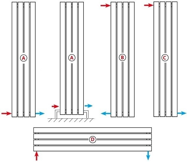 Мы предусмотрели разные варианты разводки труб, чтобы вы могли подключить радиатор так, как удобно именно вам. У радиаторов Mivarmo — четыре схемы подключения: A — нижнее левое или правое подключение. В нижнем коллекторе установлен разделитель потока, который равномерно распределяет теплоноситель. Идеально подходит для вертикального размещения радиатора, особенно если вы хотите сохранить чистую стену без видимых труб. B — боковое левое или правое подключение. Классика для вертикальных радиаторов: подключение сбоку удобно, если трубы идут по стене и не планируется скрытая разводка. C — диагональное левое или правое подключение. Обеспечивает равномерный прогрев всей поверхности радиатора. Применяется для вертикальных моделей, особенно когда важна максимальная теплоотдача. D — нижнее левое или правое разностороннее подключение. Используется в горизонтальных радиаторах: подача и обратка заходят с разных сторон. Подходит для скрытой подводки — эстетично и функционально. Для удобства подключ