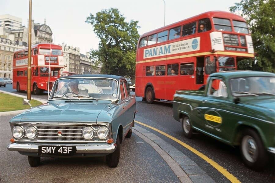 Советский автомобиль в центре британской столицы символизирует начало автомобильного экспорта и культурных взаимодействий.