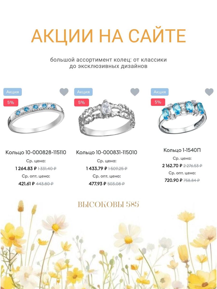 Уважаемые партнёры! 👩🏻💻✨ Приглашаем вас воспользоваться специальными акциями для оптовых клиентов на нашем сайте: https://vysokovy585.ru/catalog/sale/ В наличии широкий ассортимент колец: классические, обручальные и трендовые модели. Мы открыты к долгосрочному партнёрству и предлагаем индивидуальный подход к каждому клиенту. Работая с нами, вы получаете качественный товар по выгодным ценам и надежную поддержку на всех этапах сотрудничества. Загляните в каталог и оформите заказ прямо сейчас — акционные предложения ограничены по времени! 🤍