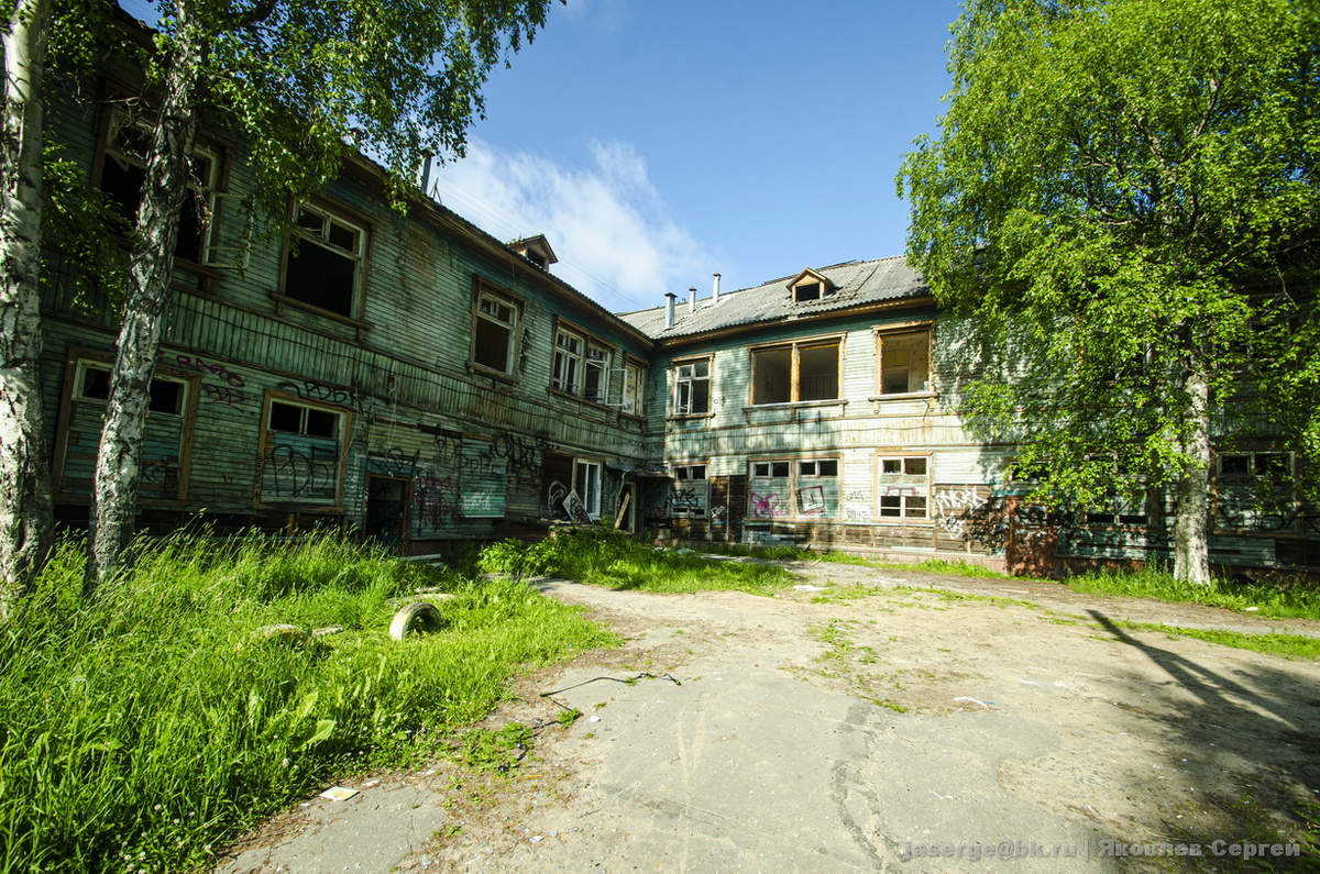 В центре Северодвинска можно встретить много заброшенных деревянных домов 30-40-хх гг XX века. Со стороны мы на многие смотрим на моих экскурсиях, выглядят они сейчас печально, но при постройке были роскошны и во многих жили люди непростые (например, малую часть детства провел В.С. Пикуль). С каждым годом таких домов становится все меньше и меньше. Не дерево, но здание тоже заброшенное - 7ая школа.