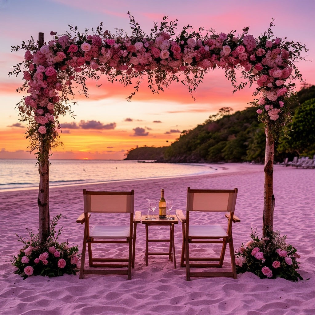 Маркос привел Кристину на пустой пляж Shugar Beach - розовый песочек, закат, аккуратно сложенные шезлонги. Красивая арка, украшенная цветами, столик с шампанским. Все подготовил, ничего не забыл!