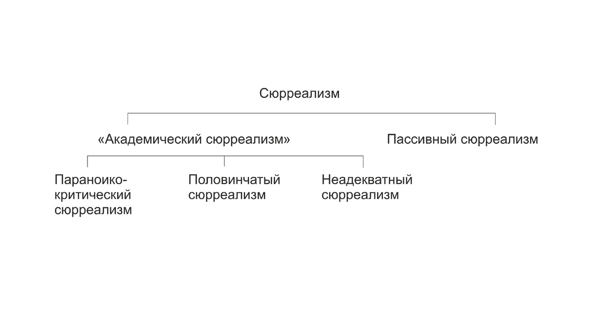 Термин «сюрреализм» у нас обычно переводят как «сверхреализм». Это не совсем точно, ибо отцы направления считали сюрреализм «над-реализмом», т. е. стадией, стоящей на порядок выше реализма. Это было закреплено и в манифесте: «Реализм означает цветущее дерево, сюрреализм – цветущая жизнь».