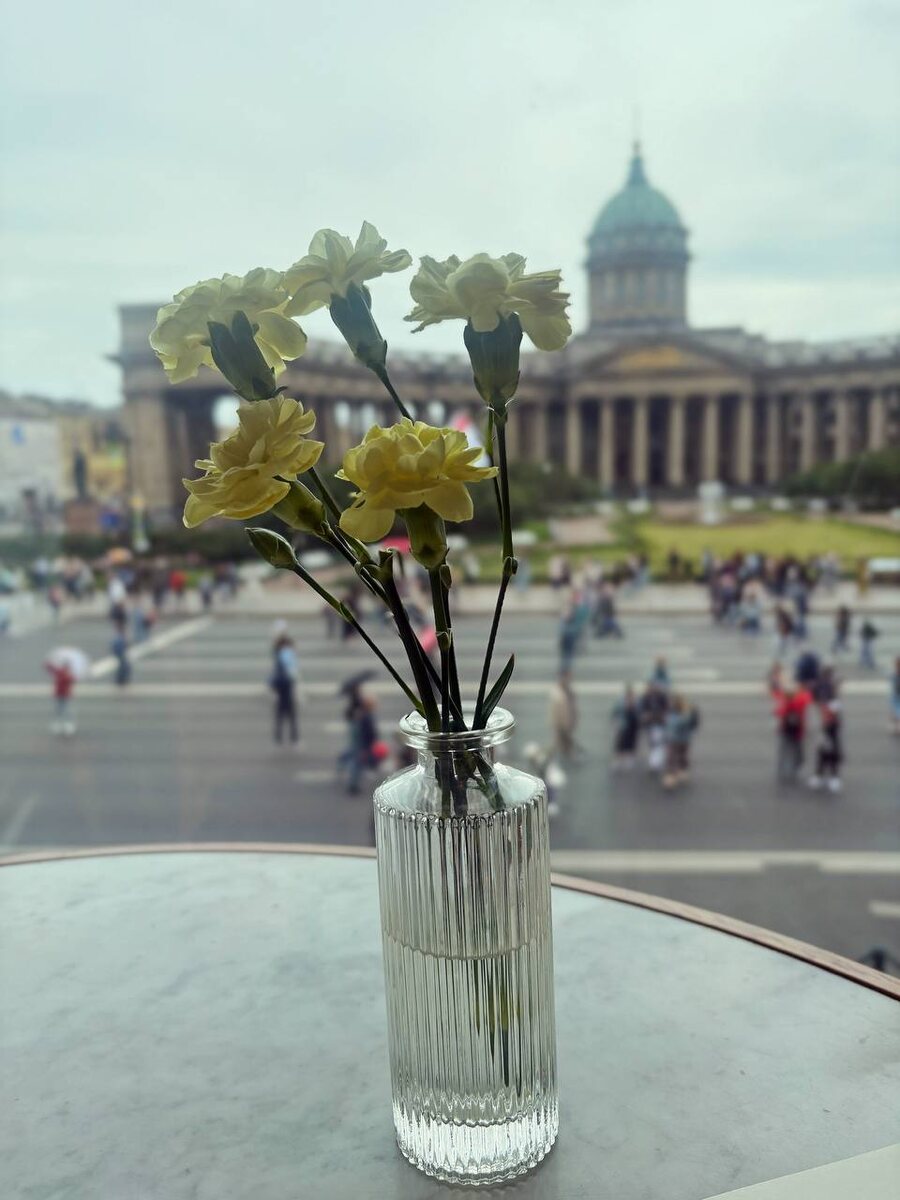 Это кафе русской и французской кухни с уже легендарными столиками у окна — с тем самым видом на Казанский собор. Думаю, описывать вид нет смысла — вы и так все знаете 😉 Но предупреждаю сразу: если хотите сесть у окна, бронируйте столик заранее. Я забронировала за месяц, потому что за неделю вы уже вряд ли поймаете этот волшебный столик — только если случайно повезёт.