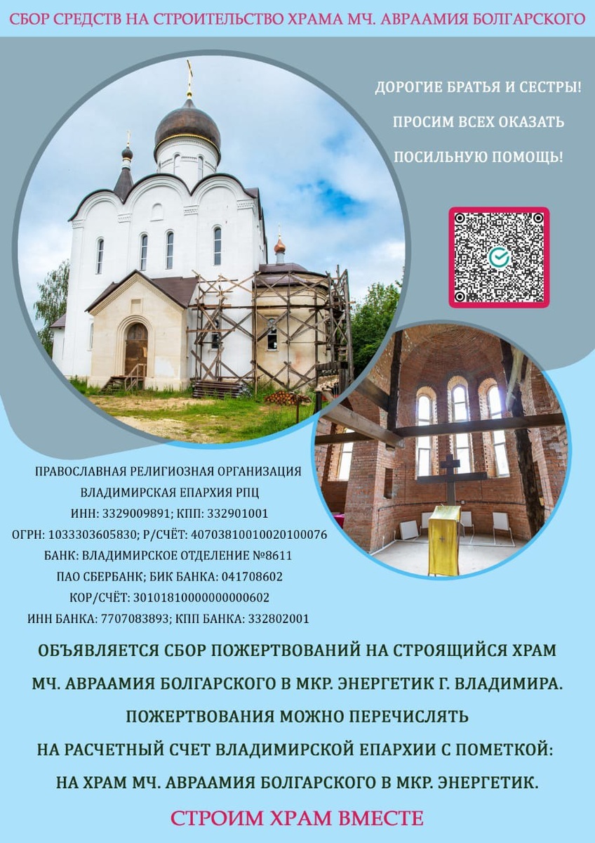 Дорогие братья и сестры! Строящийся храм мученика Авраамия Болгарского в мкр. Энергетик нуждается в вашей поддержке! Оказать посильную помощь вы можете через указанный на афише QR-код или реквизиты с пометкой "на храм мч. Авраамия Болгарского в мкр. Энергетик": Получатель: ПРАВОСЛАВНАЯ РЕЛИГИОЗНАЯ ОРГАНИЗАЦИЯ ВЛАДИМИРСКАЯ ЕПАРХИЯ РПЦ ИНН: 3329009891 КПП: 332901001 ОГРН: 1033303605830 Расчётный счёт: 40703810010020100076 Банк: ВЛАДИМИРСКОЕ ОТДЕЛЕНИЕ №8611 ПАО СБЕРБАНК БИК банка: 041708602 Корреспондентский счёт: 30101810000000000602 ИНН банка: 7707083893 КПП банка: 332802001