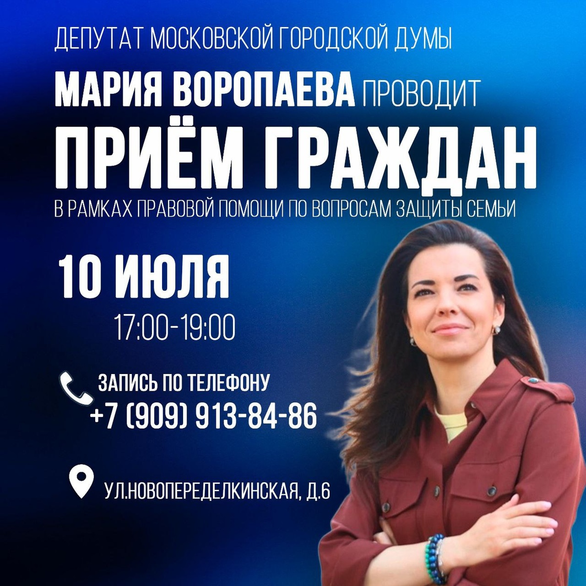 Приглашаем вас на прием к Депутату Мосгордумы Марии Воропаевой Когда❓ 10 июля с 17:00 до 19:00 Где❓ Москва, ул.Новопеределкинская, д.6 ☎Запись по телефону: +79099138486