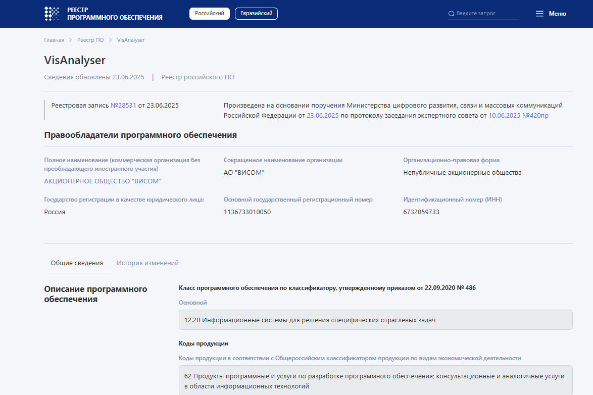 Реестровая запись №28531 от 23.06.2025 подтверждает, что программа VisAnalyser является собственной разработкой компании «Висом», проверена и рекомендована государством для приобретения предприятиям, конструкторским бюро, вузам, ЦСМ службам, испытательным лабораториям и другим компаниям для проведения сбора, регистрации и анализа данных.