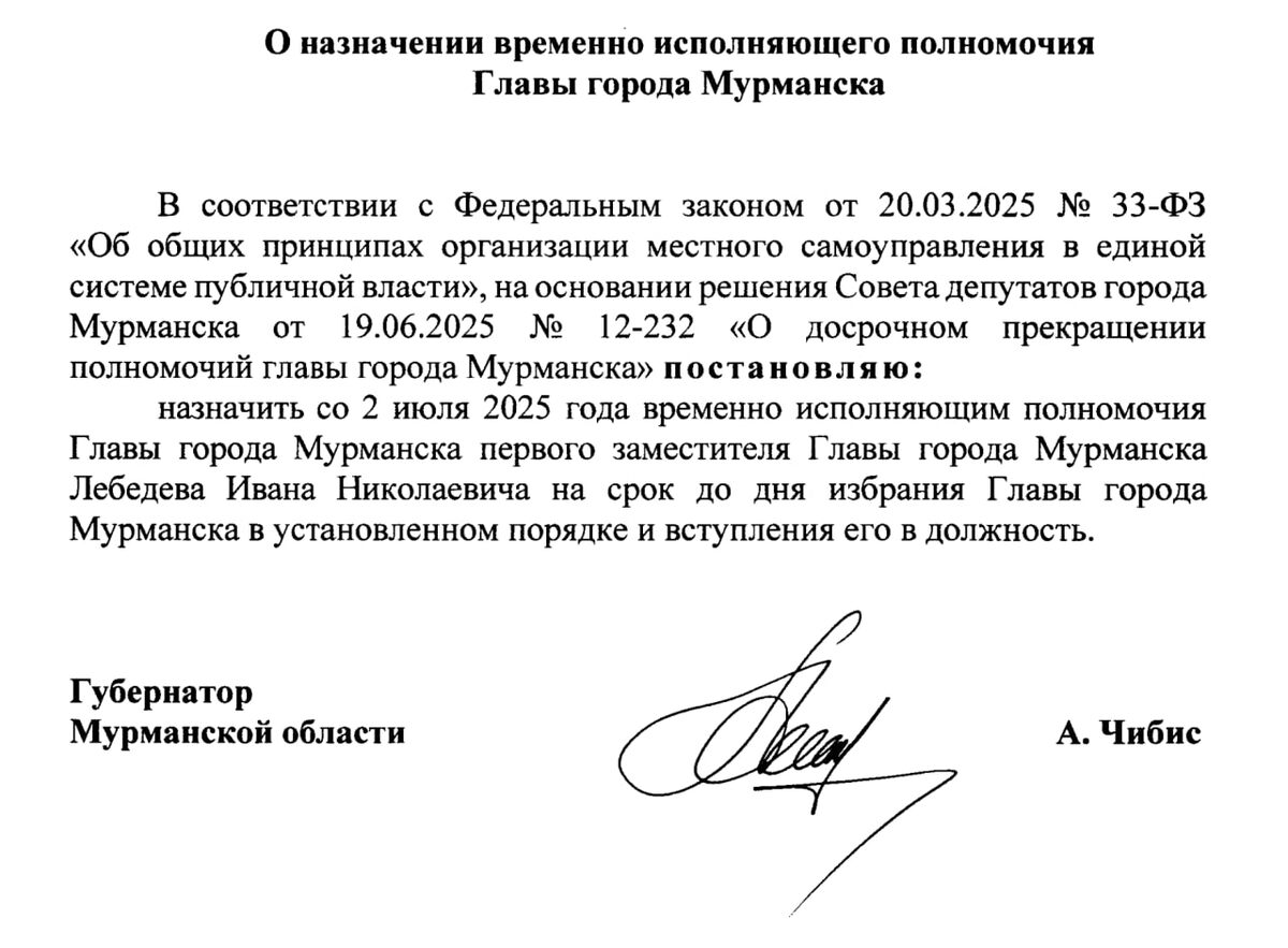 В ответ на пост #Официально на ❄ «Арктическом Обозревателе»: Губернатор Мурманской области Андрей Чибис назначил Ивана Лебедева временно исполняющим обязанности главы города Мурманска с 20 июля 2025 года. Примечательно, что в постановлении о назначении Лебедева главой губернатор ссылается на закон, вступивший в силу 19 июня 2025 года, хотя, на мой взгляд, это очевидная процедура: когда отсутствует глава, его обязанности исполняет старший из заместителей. Впрочем, Андрей Чибис уже назначал Ивана Лебедева – год назад он был представлен как заместитель тогда ещё сити-менеджера Юрия Сердечкина.