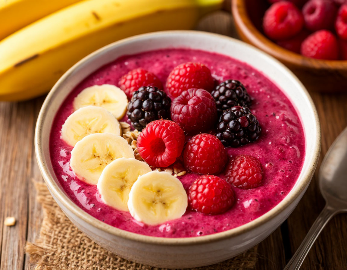 Что нужно: Как делаю: 1. В блендере взбиваю банан, ягоды и йогурт. 2. Выкладываю в миску, украшаю ягодами и орехами. Фишка: Если положить чуть мёда или финика — будет слаще.