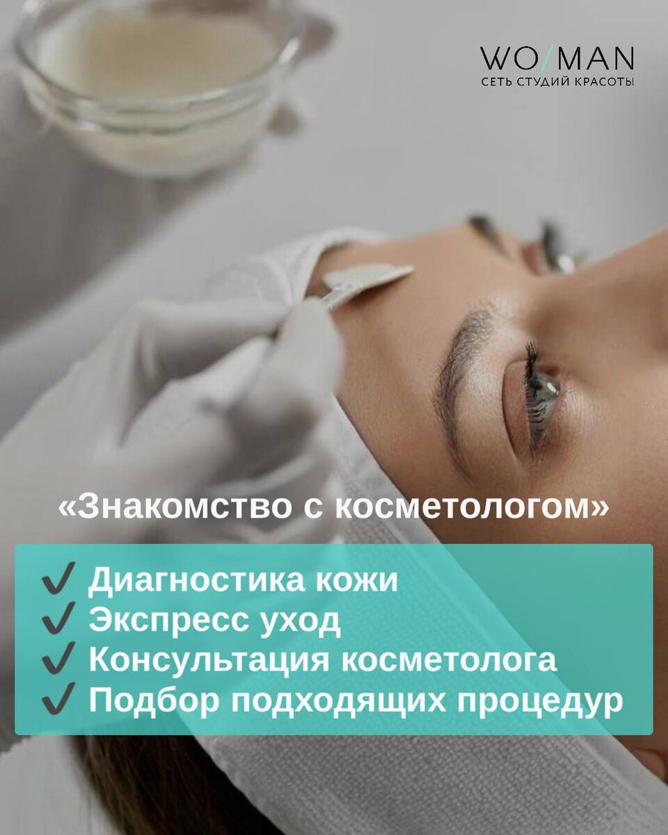 Специальное предложение «Знакомство с косметологом» Wo/Man 💜 Акция действует на первое посещение косметологического кабинета. ✔️Диагностика кожи лица ✔️Экспресс уход ✔️Консультация косметолога с разбором домашнего ухода и подбором подходящих процедур для вашей кожи. Получите персональные рекомендации по лечению и устранению эстетических недостатков кожи! Записывайтесь к нам на бесплатную первичную консультацию с экспресс уходом в подарок 🎁 Для записи пишите нам @womansalonchat 💌