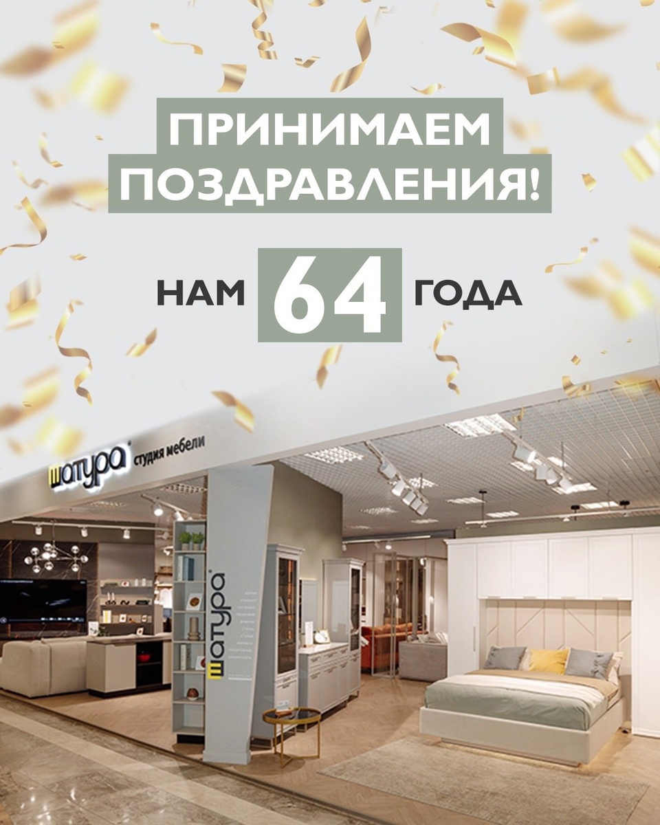 ПРИНИМАЕМ ПОЗДРАВЛЕНИЯ! 🎉✨ 3 июля ШАТУРА отмечает 64-й день рождения — дату, с которой началась большая мебельная история… ⠀ 64 года назад мы выпустили первый шкаф. А сегодня уже создаём комплексные интерьерные решения — кухни, корпусную и мягкую мебель, индивидуальные проекты и готовые композиции, где всё подчинено одной идее: комфорту и стилю👌🏻 ⠀ Более 500 салонов в России и странах СНГ, собственное производство, десятки коллекций и миллионы домов, где живёт ШАТУРА. Благодарим вас — наших клиентов, партнёров и всю команду — за доверие, выбор и вдохновение, которое вы даёте нам каждый день.🫶🤝 ⠀ Мы продолжаем создавать мебель, которая делает интерьер практичным, стильным, а вашу жизнь — комфортной. Спасибо, что выбираете ШАТУРА❕ ⠀