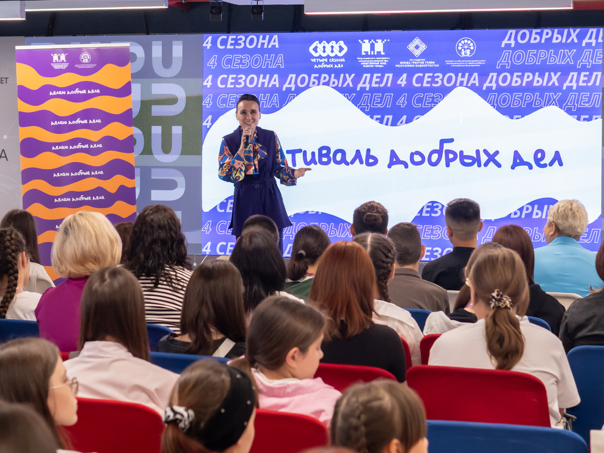 В «Точке кипения» межвузовского кампуса Евразийского НОЦ состоялся финальный фестиваль регионального проекта «4 сезона добрых дел». В мероприятии приняли участие 170 подростков и взрослых со всей республики — активные команды, реализовавшие добровольческие инициативы в своих районах. День начался с оживленного общения: участники собирались задолго до официального старта, делясь впечатлениями и заряжаясь энергией перед насыщенной программой. В холле работала фотозона, где ребята делали памятные снимки, а кофе-брейк с ароматным чаем помог восстановить силы после дороги. После регистрации каждый получил тематический набор: шоппер с символикой проекта, деревянный значок «Делаю добрые дела», открытку, блокнот, ручку и наклейки. Эти сувениры не только напоминали о событии, но и подчеркивали ценности добровольчества. Перед основной программой участники отправились на экскурсию по межвузовскому кампусу Евразийского НОЦ. Лаборатории, лекционные залы и современная инфраструктура впечатлили школь