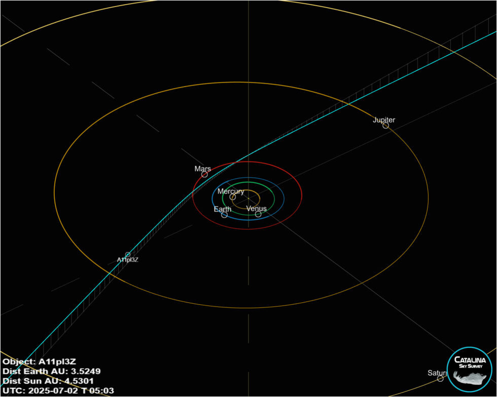 Сейчас A11pl3Z находится внутри орбиты Юпитера, а к октябрю приблизится к Земле — до орбиты Марса. Однако угрозы для нашей планеты он не представляет: в момент наибольшего сближения с Солнцем объект будет находиться по другую сторону светила, относительно Земли.