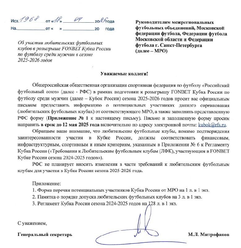 ❗️ Стало известно, почему футбольный клуб «Псков» не примет участие в Кубке России Для участия в Кубке России любительские клубы, помимо подтверждения заинтересованности, должны соответствовать финансовым, инфраструктурным, спортивным и иным критериям, указанным в приложении к регламенту турнира прошлого сезона, говорится в официальном письме Российского футбольного союза (РФС) за подписью генерального секретаря организации Максима Митрофанова, которое есть в распоряжении редакции ПАИ (первая картинка). РФС не планирует вносить изменения в части требований к любительским футбольным клубам для участия в Кубке России 2025-2026 года – говорится в письме. В приложении прошлогоднего регламента, опубликованного на сайте РФС, есть критерий соответствия команд по спортивному принципу (вторая картинка). К участию в соревновании допускаются команды клубов ЛФК – обладатели Кубка МРО сезона 2023 года, в случае отказа – финалисты Кубка, победители чемпионата МРО 2023 года, в случае отказа призе