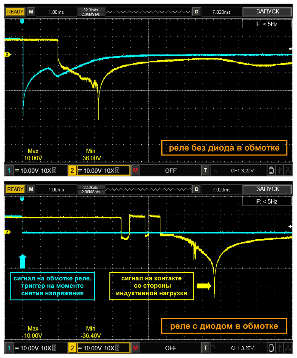 С диодом в обмотке реле, на силовых контактах появляется ДВА ПОДЪЁМА напряжения.