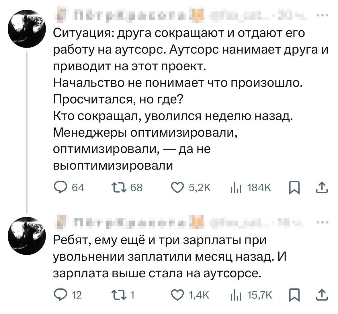 Айтишника сократили, выплатили три оклада и отдали его задачи подрядчику. Только вот подрядчиком оказался он сам — уже как фрилансер, но с более высокой ставкой.
