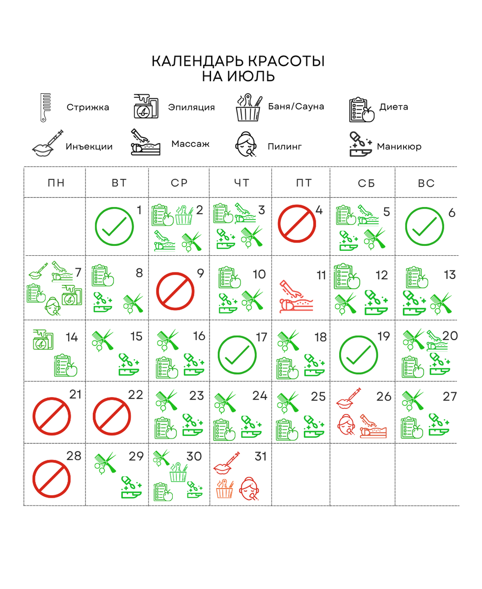 Лето в самом разгаре — и самое время позаботиться о себе. Если вы любите ухаживать за собой с учетом астрологических ритмов, этот июльский календарь красоты подскажет вам, когда лучше всего стричься, делать эпиляцию, менять мастера или обновлять имидж. Звезды знают, когда и как вам особенно пойдет «быть красивой» — а когда лучше ничего не трогать. С 4 по 31 июля Венера (планета красоты и стиля) идет по воздушному знаку Близнецов. Это даёт вам простор для экспериментов, лёгкости и игривости в образе. Советы на этот период: Вот что важно запомнить: ✅ 6–9 июля — лучшее время для любых процедур