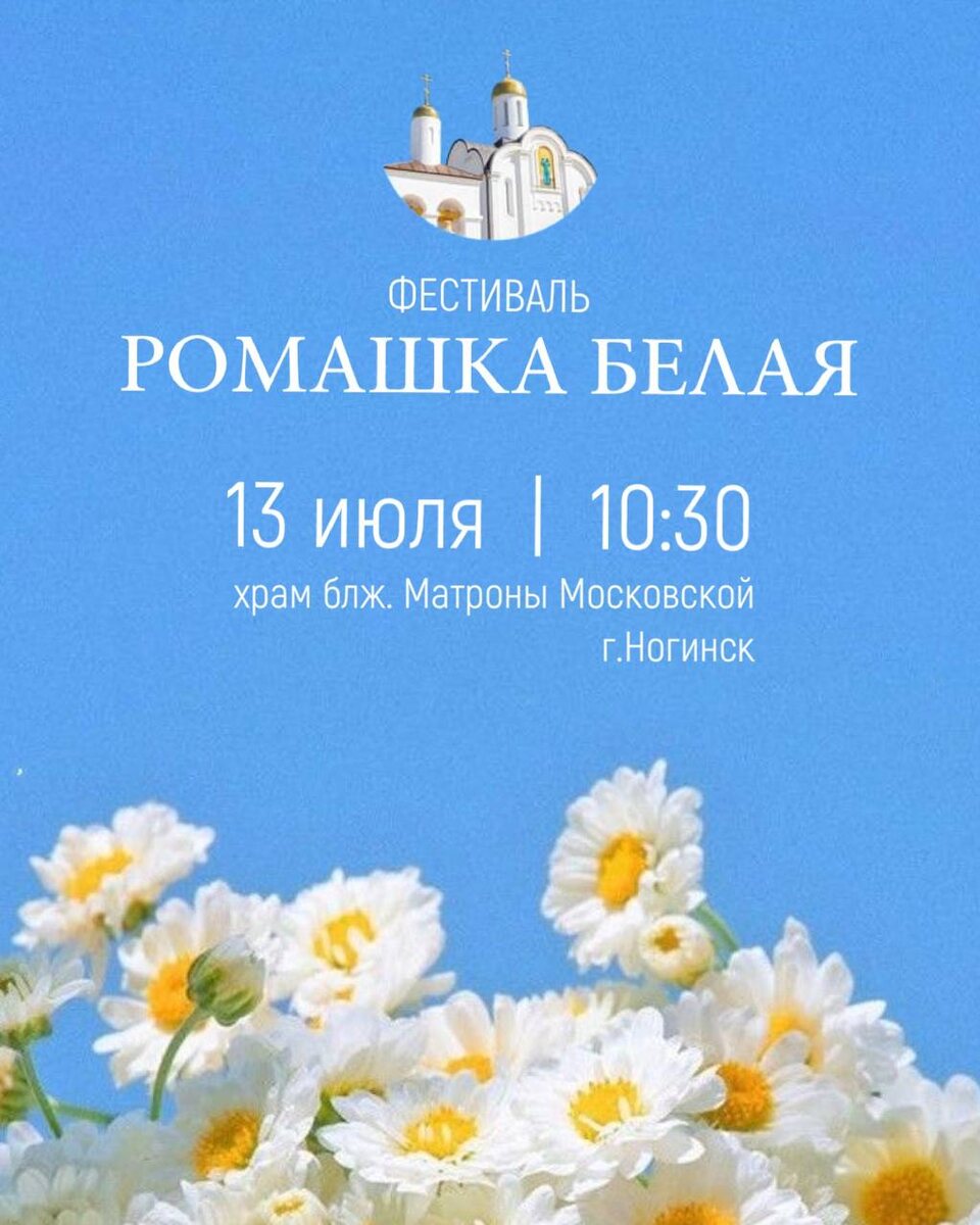 III ежегодный фестиваль «Ромашка белая», посвящëнный Дню семьи, любви и верности, пройдет в храме Матроны Московской города Ногинска. Гостей ждет театрализованный концерт, детская анимация, творческие мастер-классы для детей и взрослых, фотовыставка, беспроигрышная лотерея, угощение чаем из самовара, городок мастеров, праздничная фотозона. Приглашаем на фестиваль радости, тепла и семейного единства! 📍храм святой блаженной Матроны Московской г. Ногинск, ул. Климова, 55