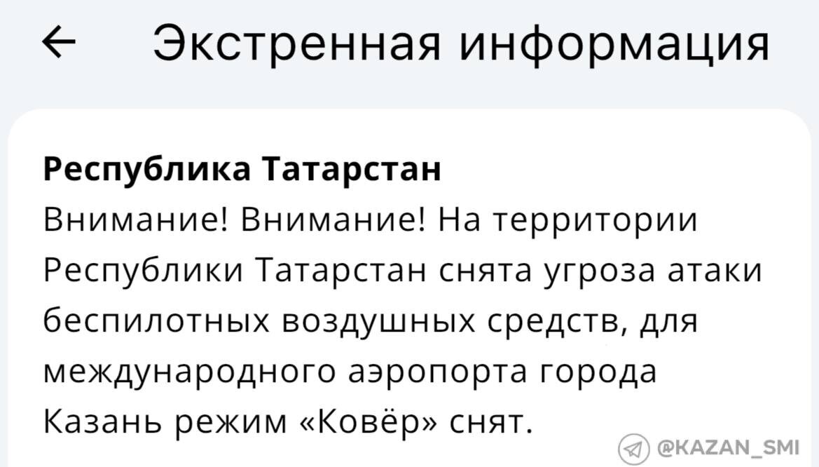🚨 Режим угрозы атаки БПЛА снят в Татарстане