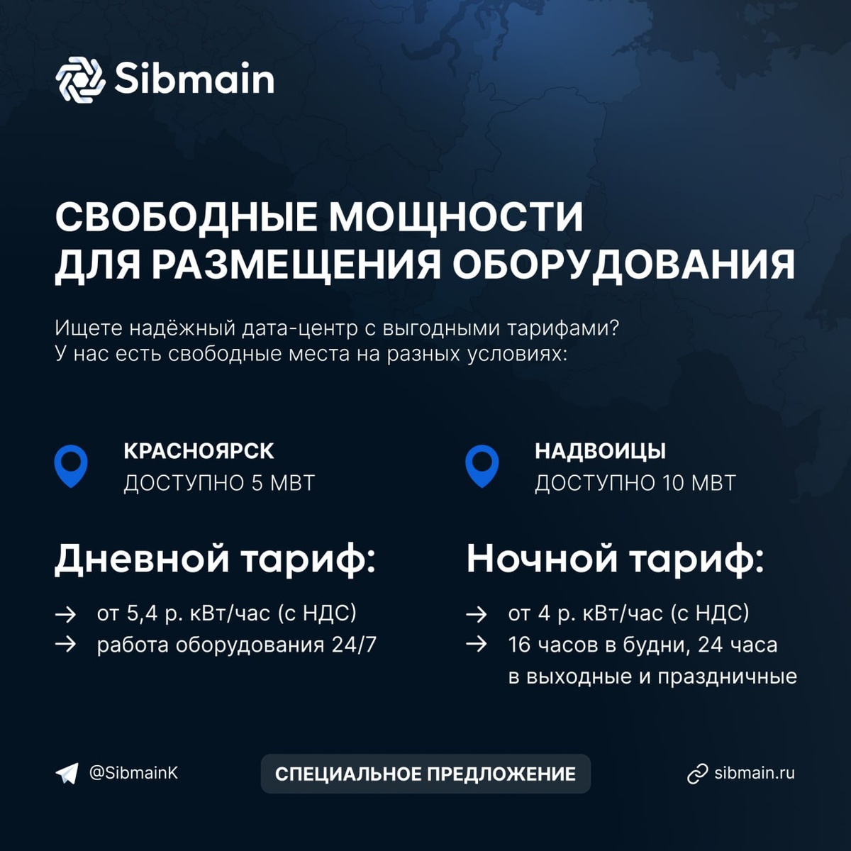 ⚡️Свободные мощности для размещения оборудования! Ищете надёжный дата-центр с выгодными тарифами? У нас есть свободные места на разных условиях: 📍 Красноярск — доступно 5 МВт по дневному тарифу 📍 Надвоицы — доступно 10 МВт по ночному тарифу 🕒 Ночной тариф действует: ⏺ 16 часов в будние дни ⏺ 24 часа в выходные и праздники Тарифы: Дневной — от 5,4 руб/кВт·ч Ночной — от 4 руб/кВт·ч Условия размещения: ⏺ Официальные площадки с круглосуточным мониторингом ⏺ Техническое и гарантийное сопровождение ⏺ Собственный сервисный центр ⏺ Персональный аккаунт-менеджер и гибкие условия сотрудничества 📍Свяжитесь с менеджером для получения индивидуального предложения